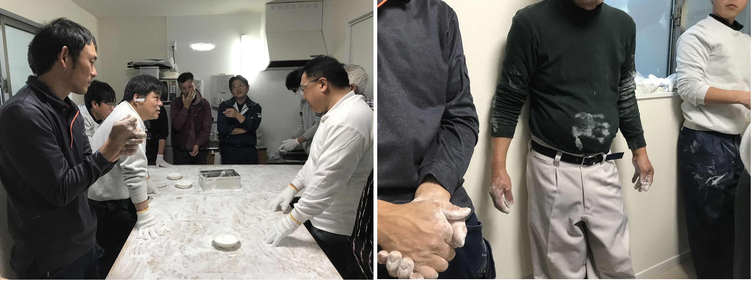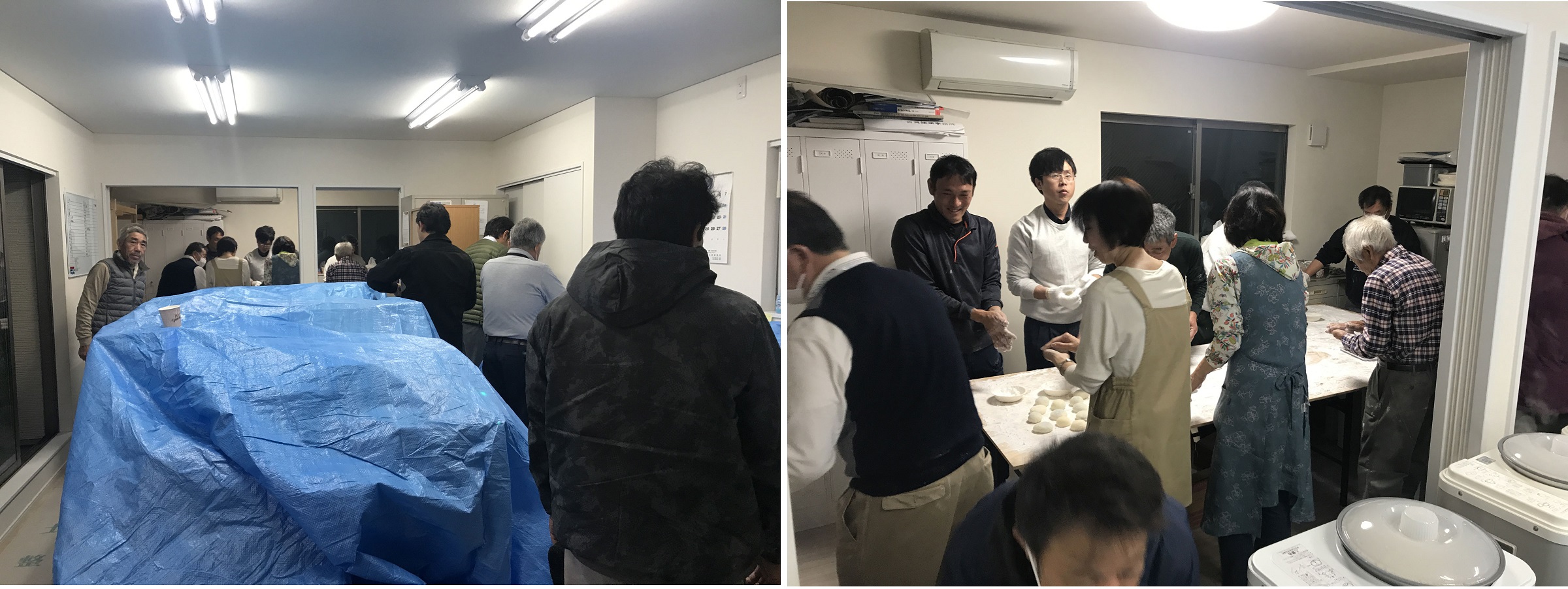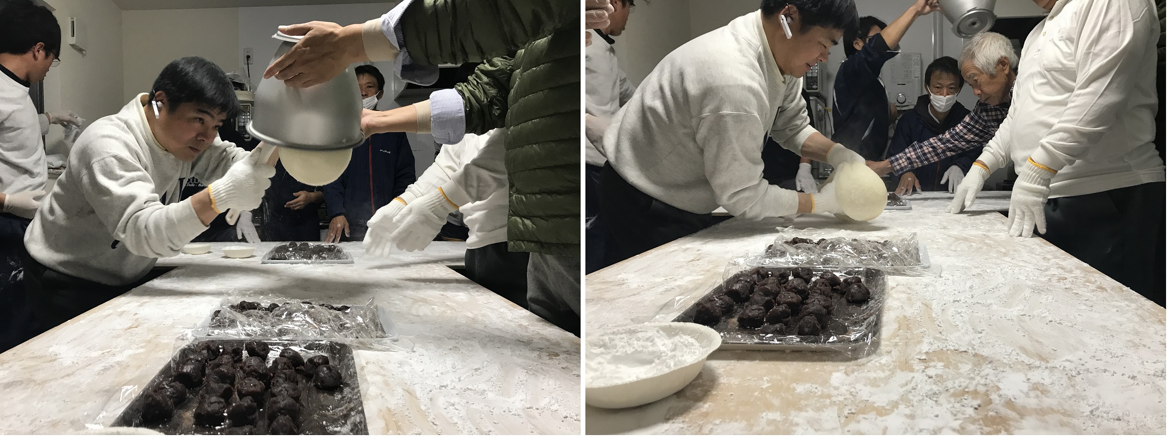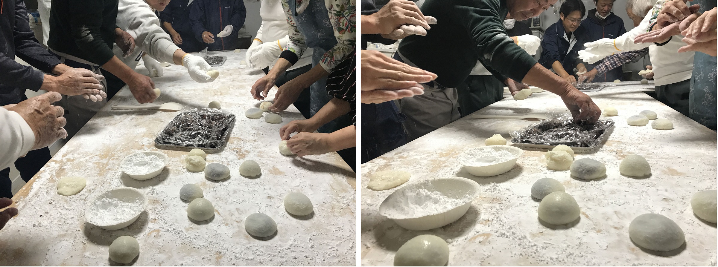 一斉に手が動き出します。熱い熱いと言いながら皆手際よく丸めます