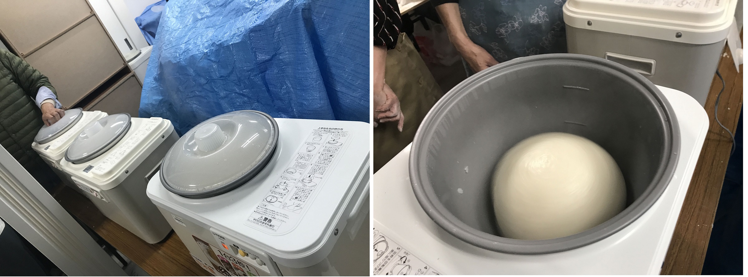 米を量る係、スイッチを押す係、記録を取る係、洗い物の係、皆で役割分担、