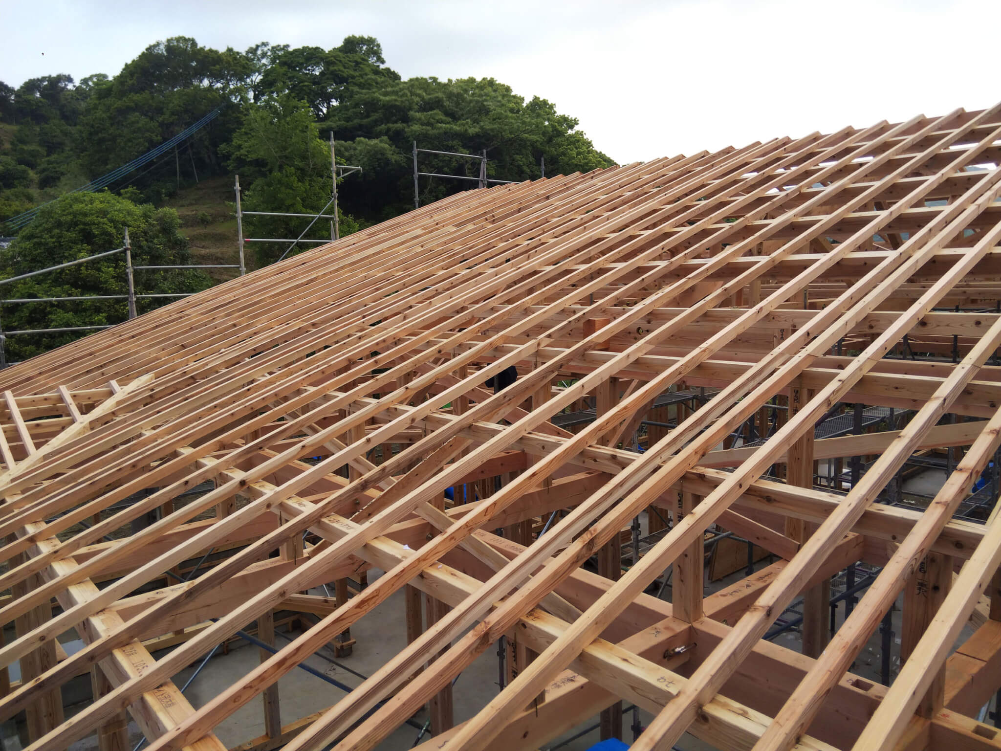 大空間を支えるため小屋組みはトラス工法です