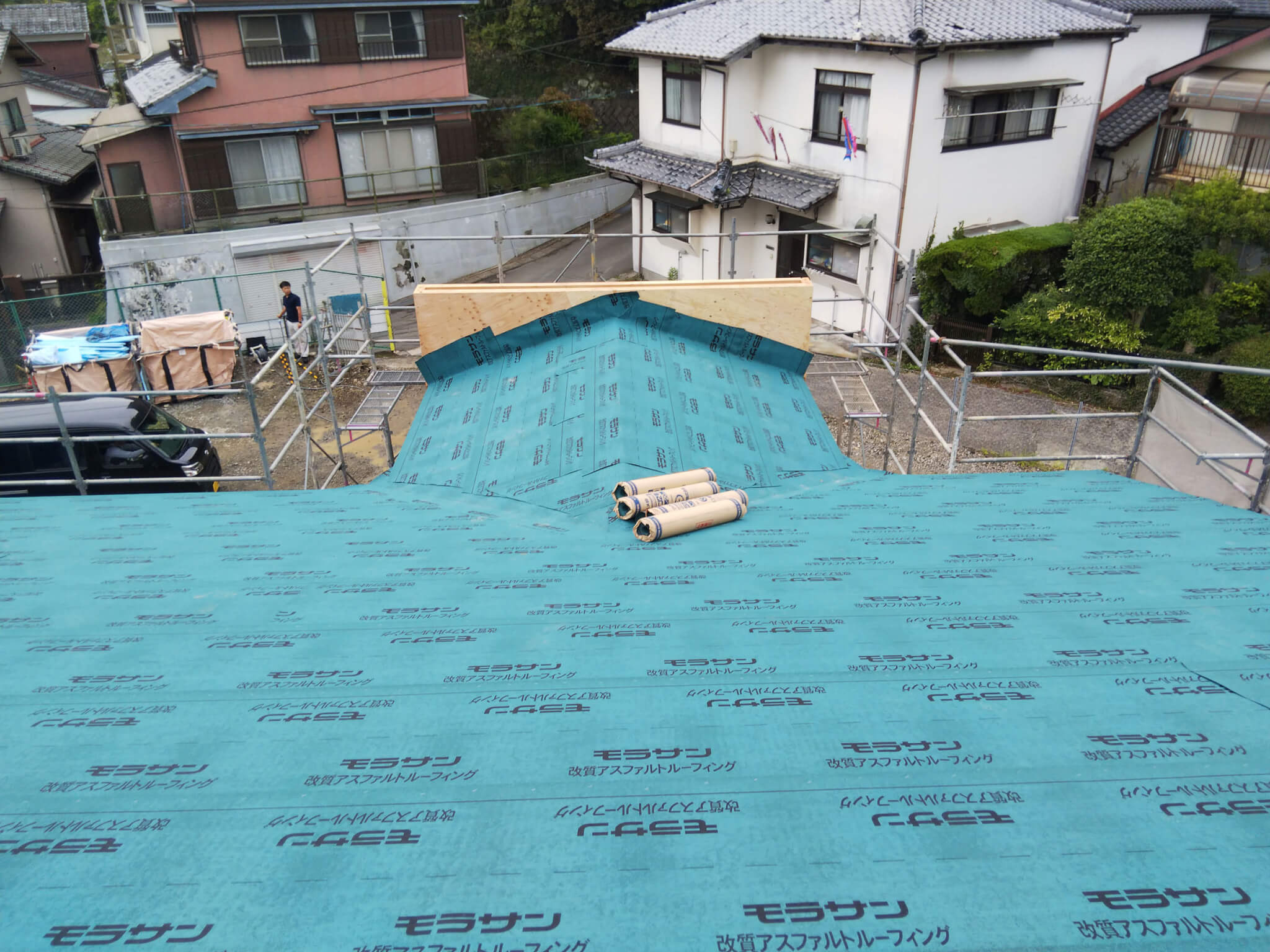 最後にルイーフングを敷いて棟上げ完了