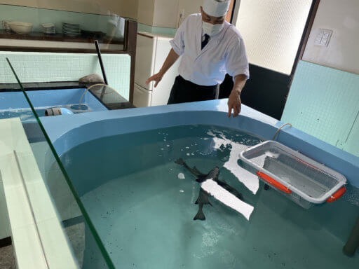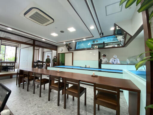 席にいても、中で泳ぐ魚や、板前さんが手際良くさばく様子が見えます
