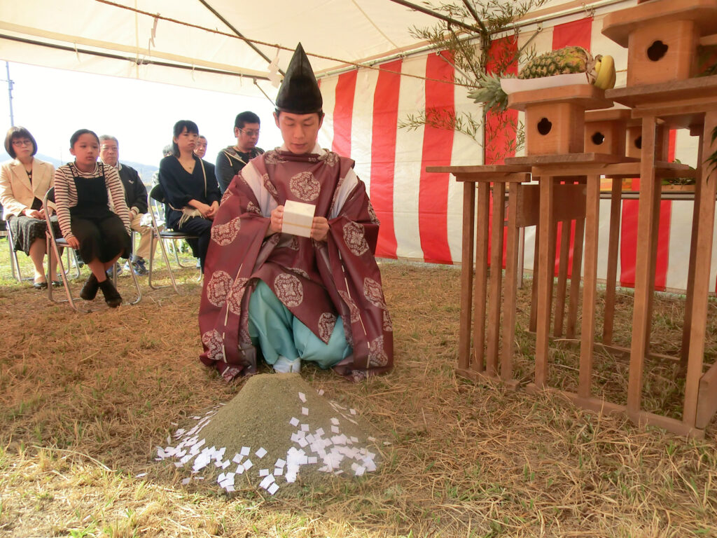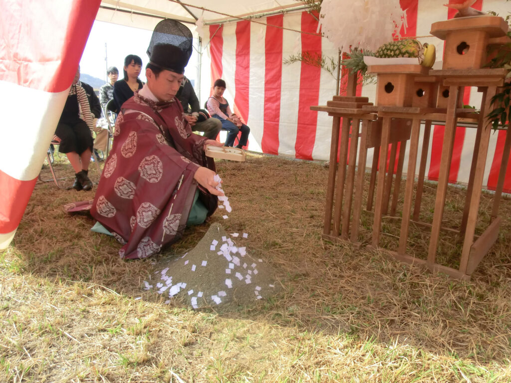 敷地の四方祓いを終えた神主様、盛り砂にお祓いの切幣(きりぬさ)を撒きました