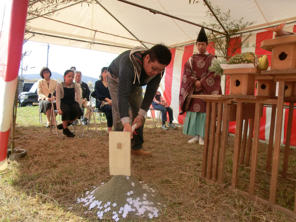 盛り砂にお施主様がざっくりと鍬入れ