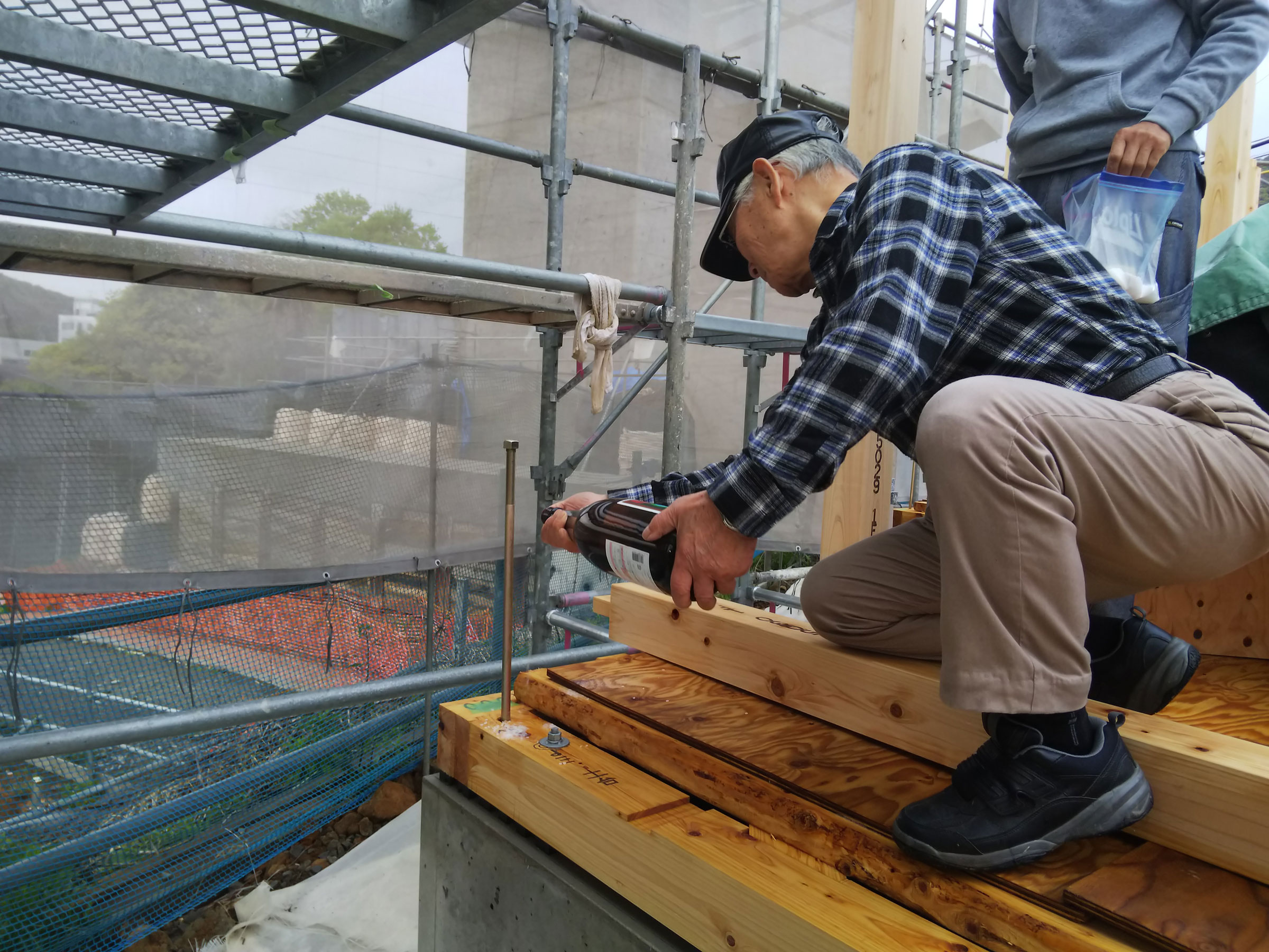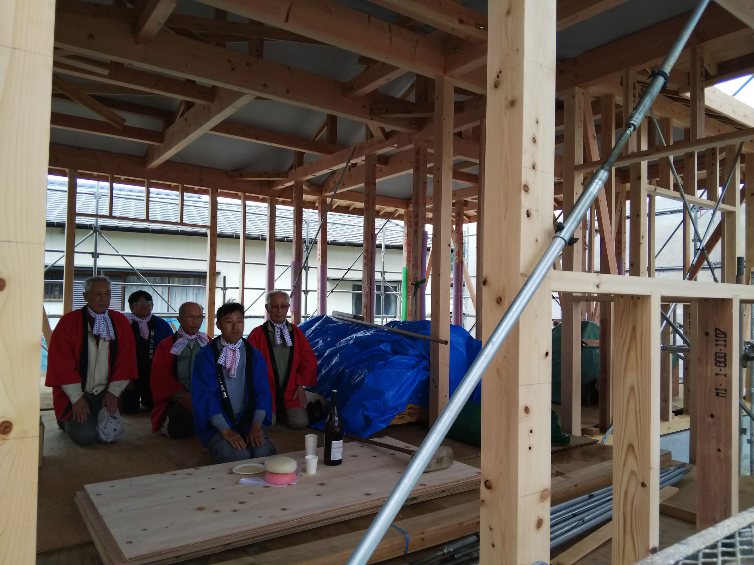 お施主様と棟梁で四隅に塩とお酒を撒きます