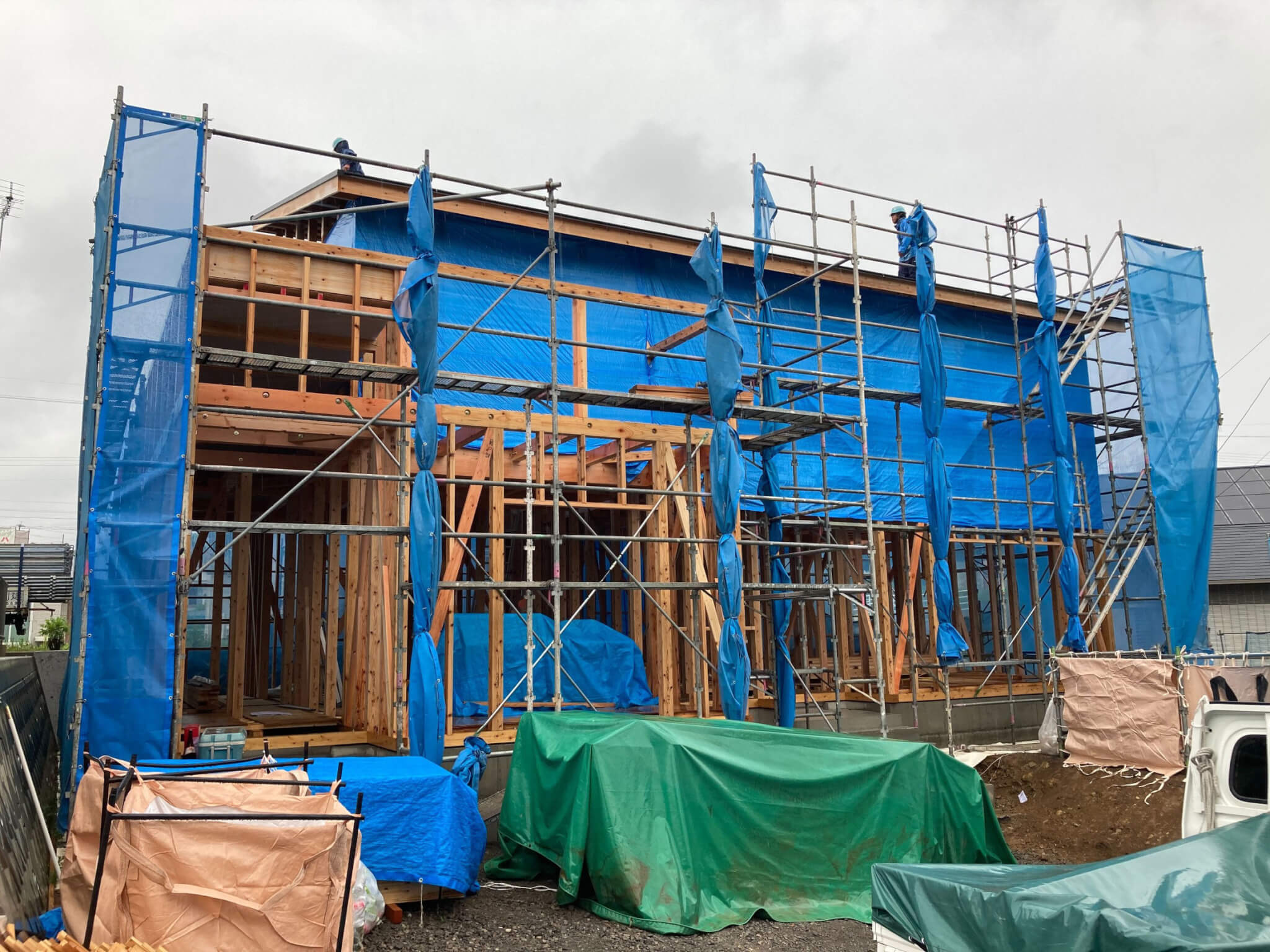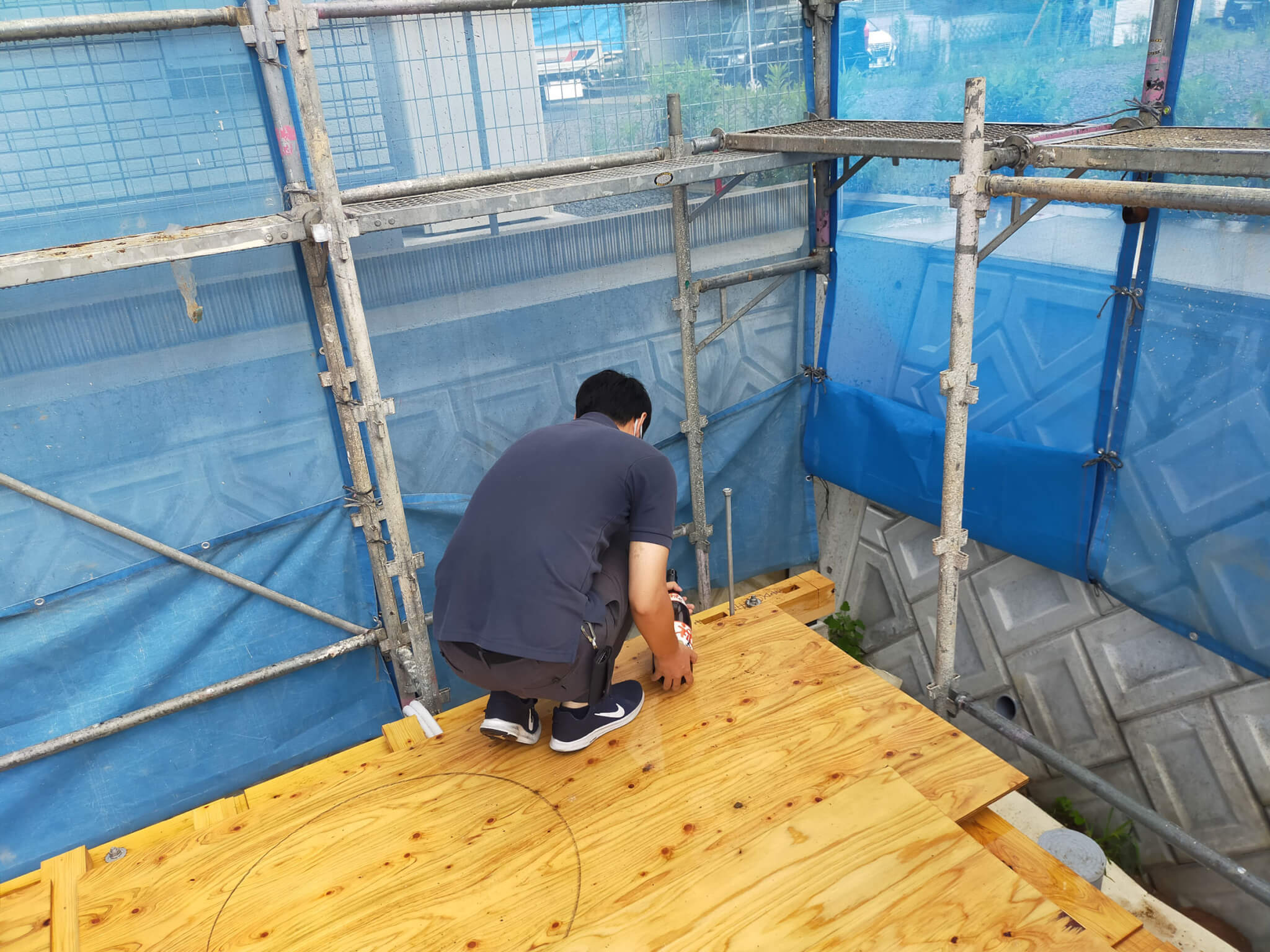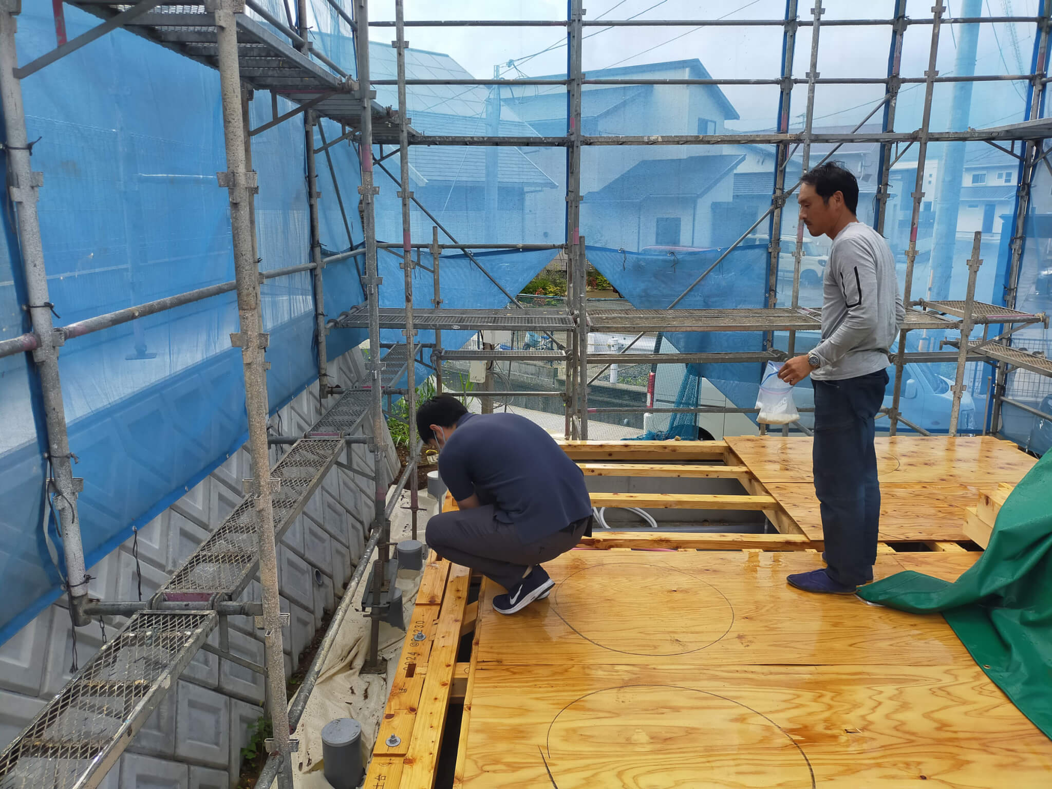 作業の前にお施主様と棟梁が土台の四隅にお酒とお米をお供えします