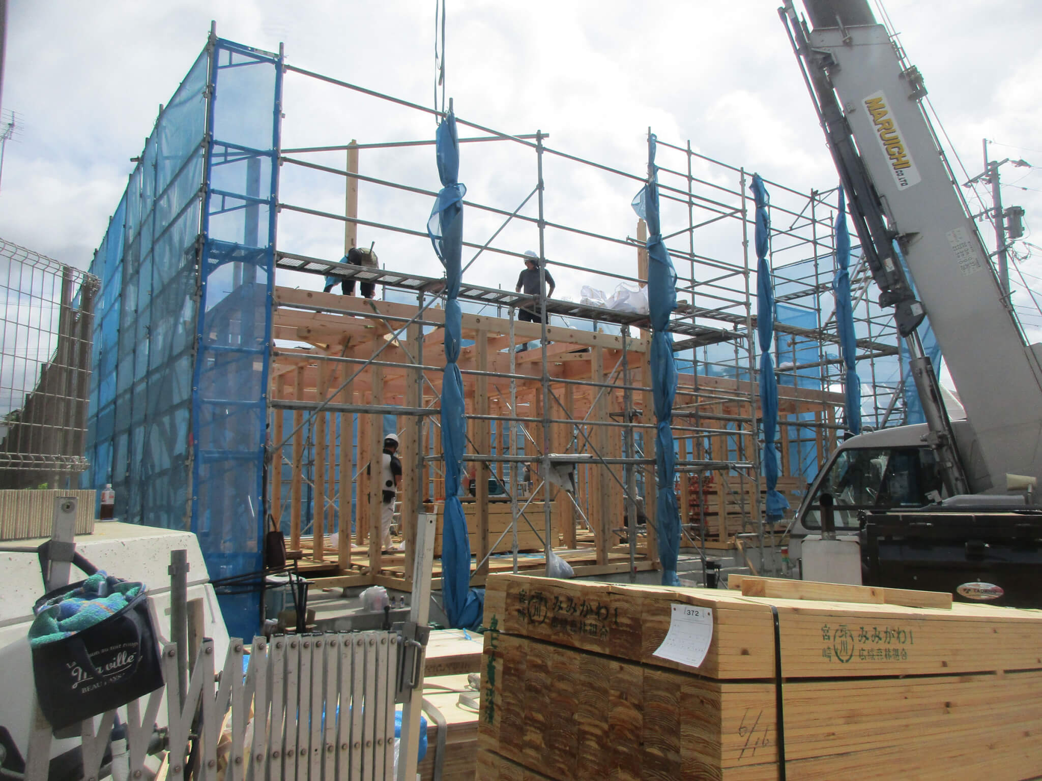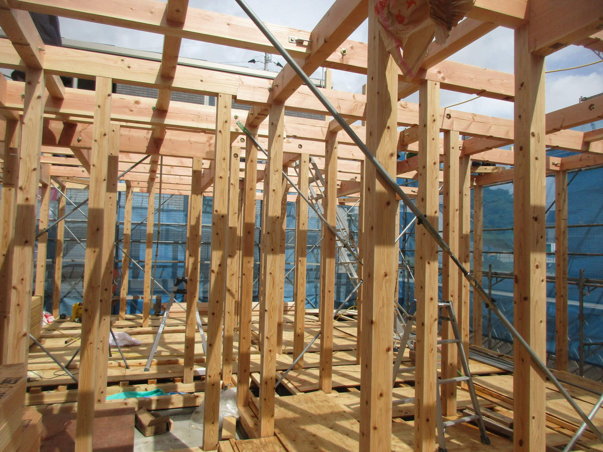 棟梁11人と花丘工事監督2名、力を合わせて、まずは1階部分の柱建て