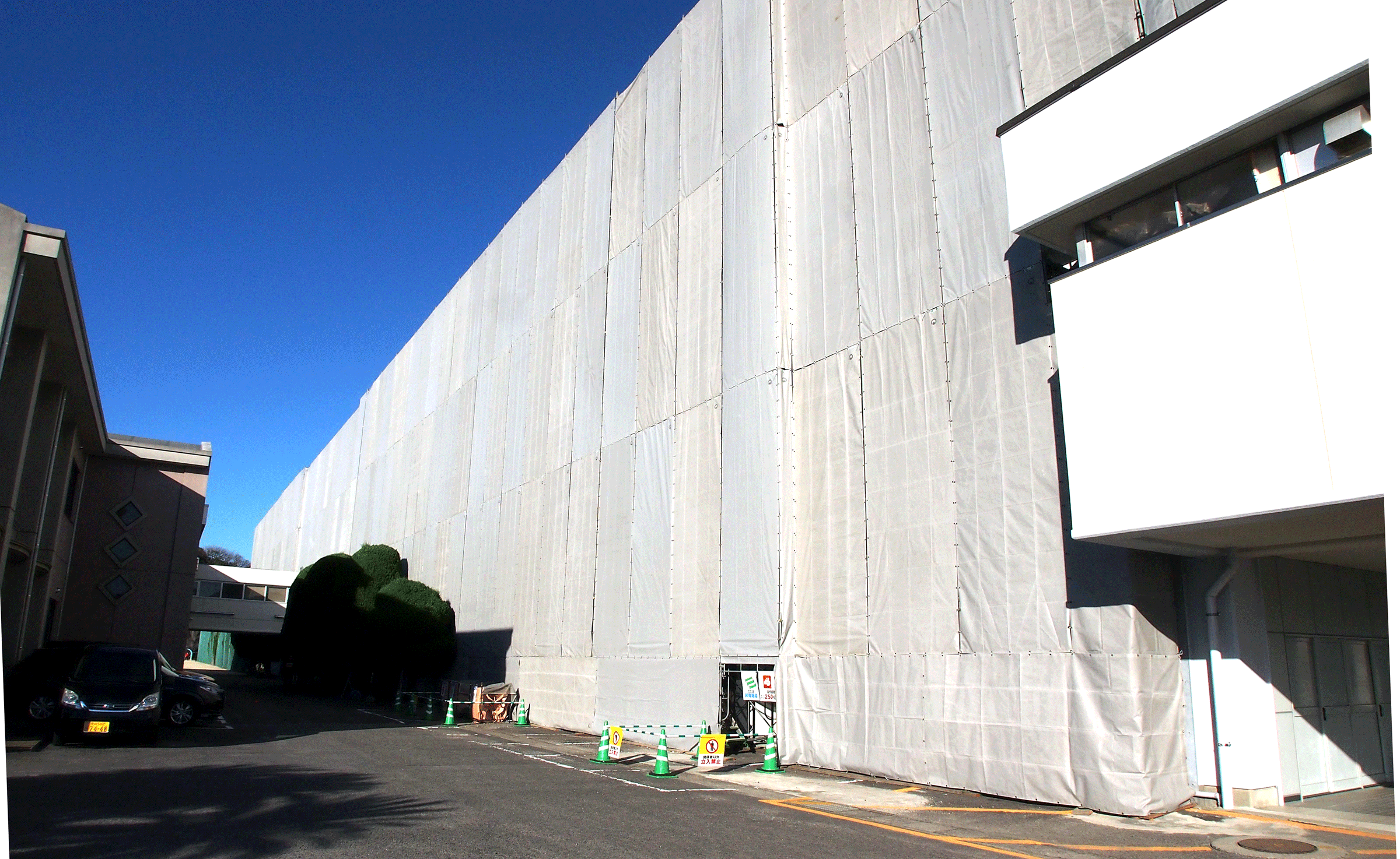 足場の長さ120m、高さ18m、幅20m 工事用シートを張り終え、