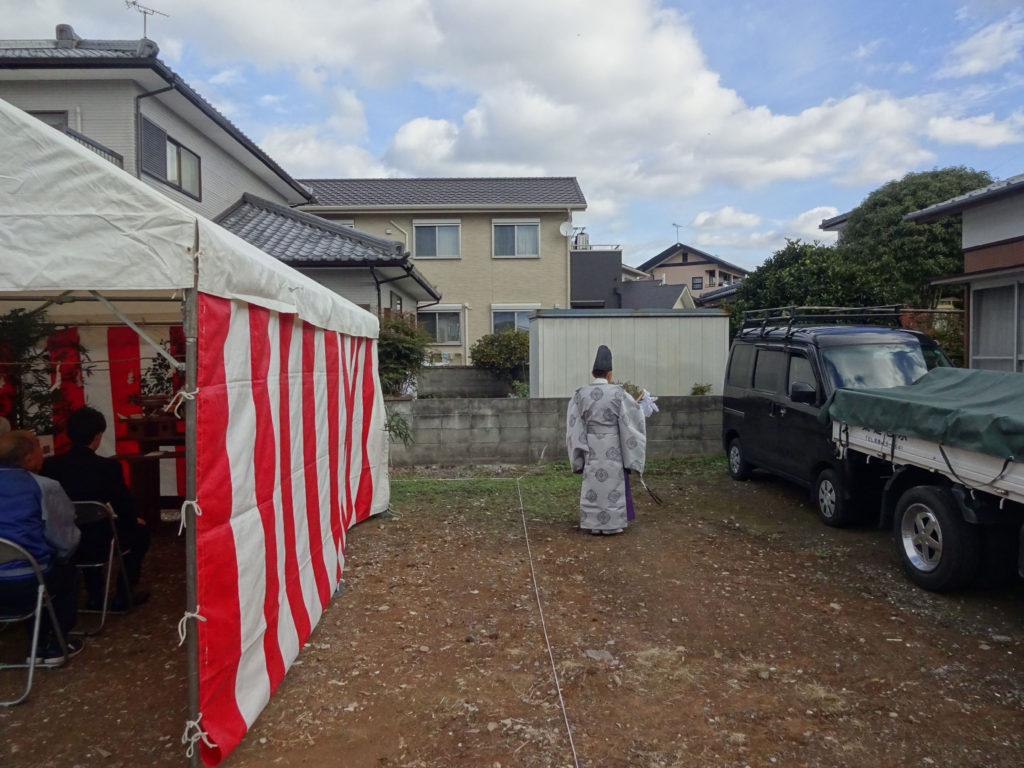 本日の神主様はお近くの富松神社様、土地のお祓い中です