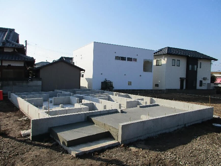 花丘建設では一般的な布基礎よりも優れた強度を誇るベタ基礎を採用しています。これは基礎コンクリートの高さ、立ち上がりの拡大、補強筋のさらなる強化などを施したもので、圧倒的な強さの実現。安定した地盤と確かな基礎が、住まいの安心を届けます。