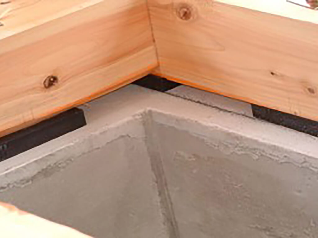 花丘建設では基礎コンクリートと土台の間に一定の間隔で換気用基礎パッキンを挟み込む全周換気工法を採用しています。これにより、床下の通気性を確保し、外壁内側に通気層を持ち、結露や湿気を屋外に放出するので耐久性もアップします。また、外部の基礎に欠込み部分がないので強度もアップします。