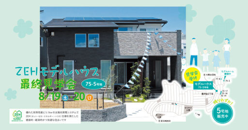 皆様にご好評いただきました、 豊洋台75-5ZEHモデルハウスは、 8月20日をもちまして、公開終了となります。 つきましては8月19日(土)・20日(日)に 最終見学会をいたします。 ご家族そろってのご来場をお待ちいたしております