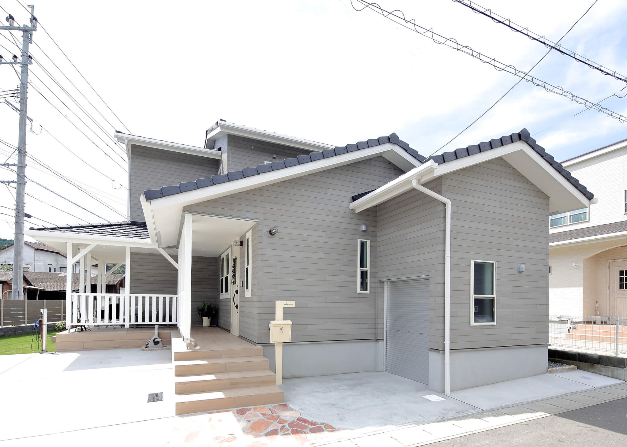 白く塗った木の手摺がラスティグレーの外壁に映え、