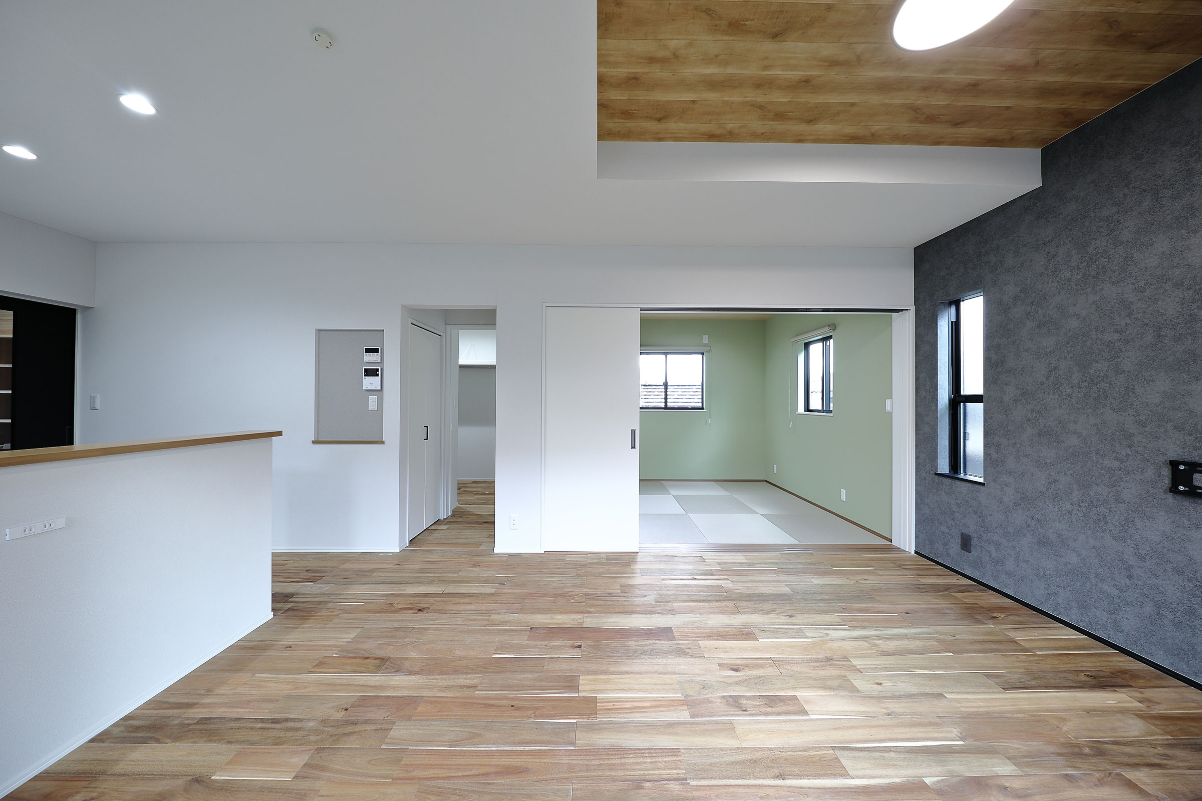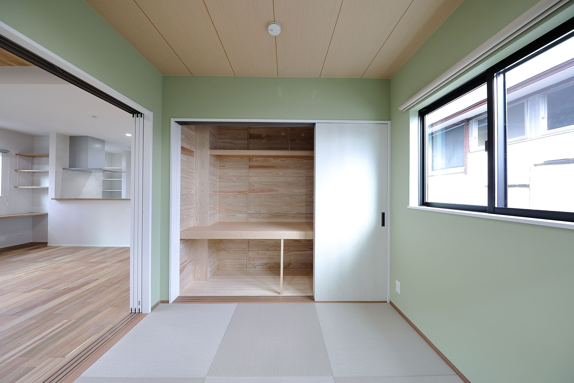 横の和室は寛ぎの淡いグリーン。