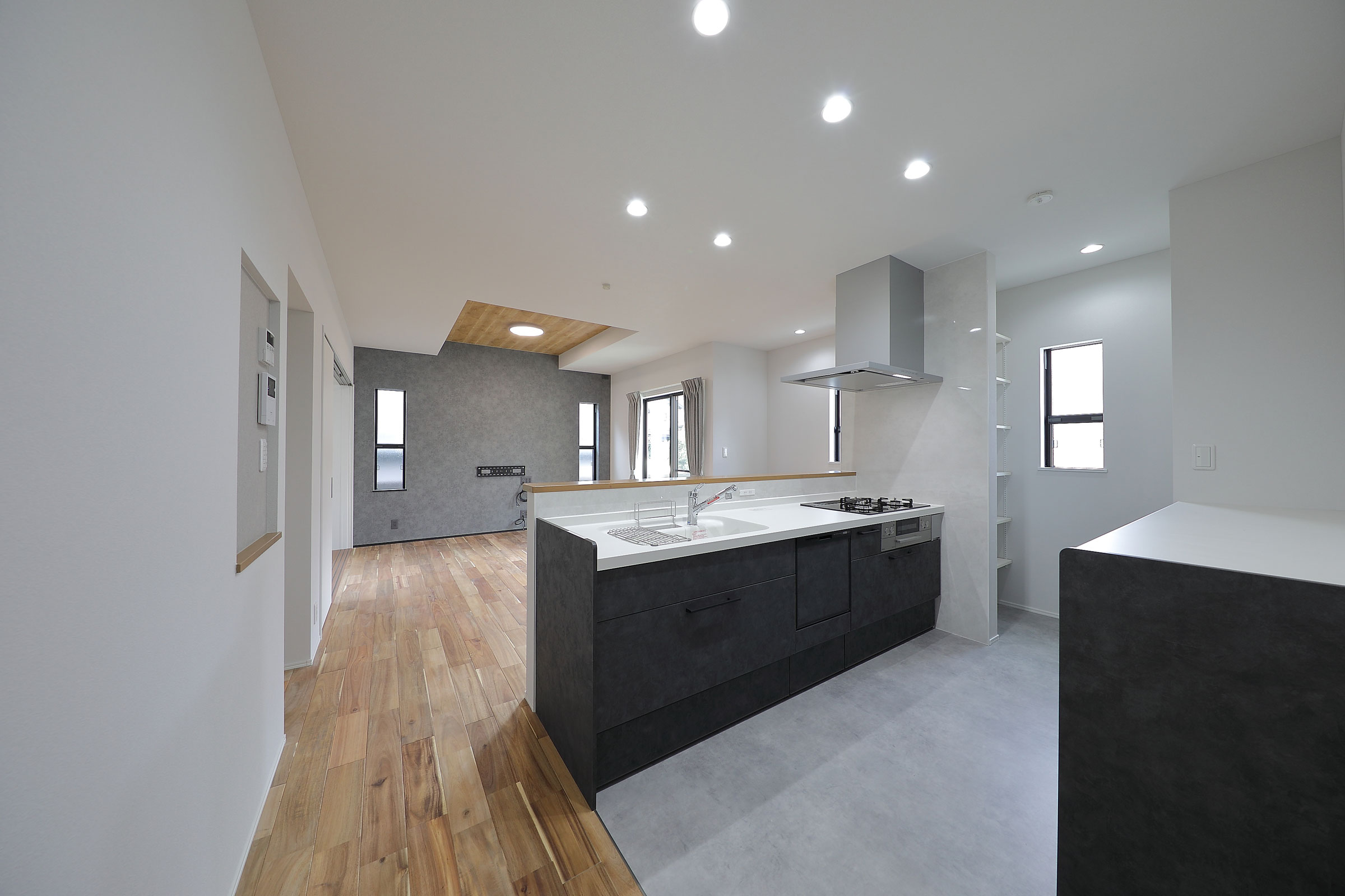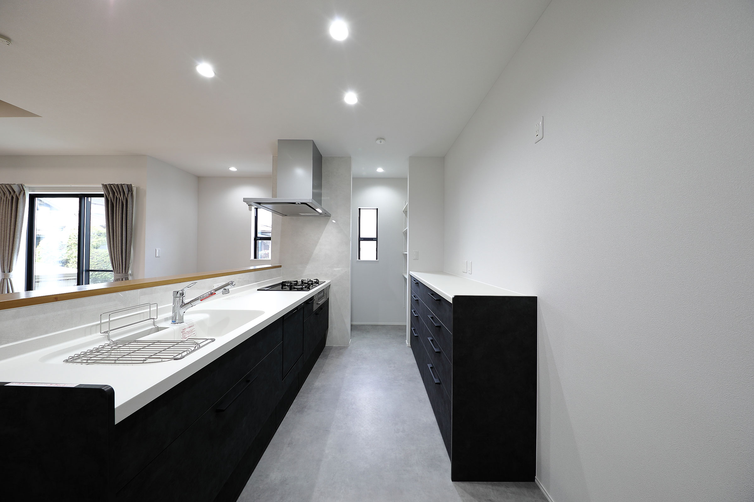 部屋中を見渡せる黒いキッチン、